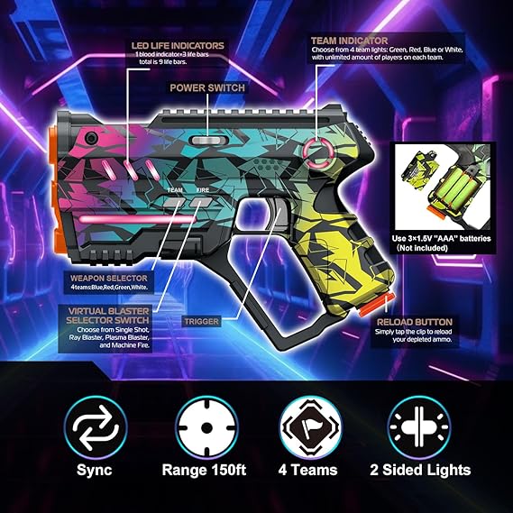 - Dual-Sided Lighting for Added Style: The laser tag gun features dual-sided lighting, adding a cool and unique visual element to the gameplay. The dazzling lights on both sides of the gun make it stand out. Also is perfect gift for 8 9 10 11 12 13 14+ year old boys girls and adults.
